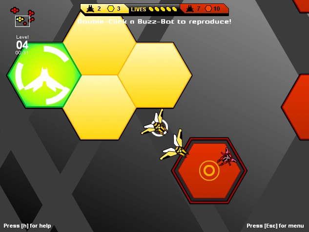 In this game, you control the yellow buzz-bots and fight for control of the hive. Click the yellow buzz-bot you started with and drag it to where you want it to go or attack, and double-click to reproduce. You can also select many of them at once by dragging your cursor to form a box around them. You can only reproduce if you have fewer units than Hexes.