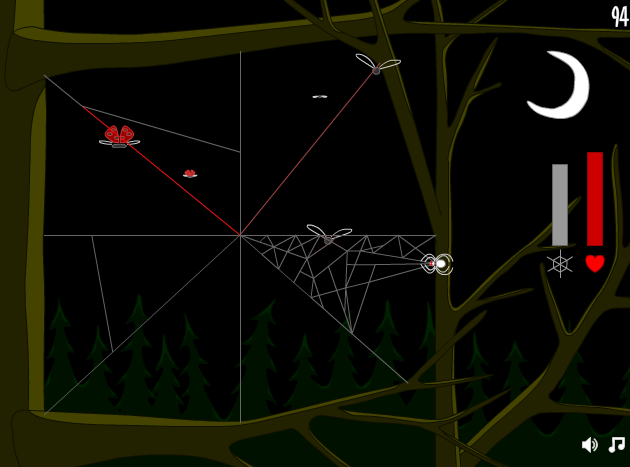You control the spider protagonist with the mouse. To move it around, simply click on the web where you want him to go and it will scurry there using the shortest available path. To spin new strands of webbing, just draw a line between two existing web strands the mouse. You can also attach strands to the branches that outlines the game area. You can design your web any way you like, but you have a limited amount of web materials available, indicated by a gauge on the right. In order to replenish it, you must eat insects and bugs which fly into your net. The bugs will appear more or less randomly from the background. Click on the insects that get caught in your web to eat them. The bigger critter types will strain your web more and be more likely to damage it, so the web must be constructed to withstand heavy impacts or it will get damaged. This will earn you points, add to your spider's web supply, and add to your life meter which is constantly depleting. If the spider’s life meter reaches zero, he dies and the game is over. You may queue up commands by giving the spider multiple marching orders. If you screw up queueing up commands or simply need to adapt to events in the level, you can easily clear the queue by pressing the Space bar.