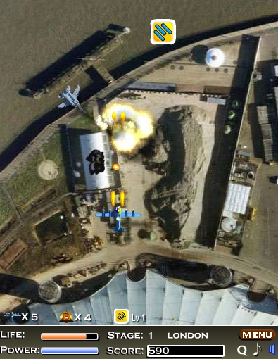 While holding the mouse button, your plane will fire a giant flameball in regular intervals. Each level increases blast damage and lessens consumption of Power. Interestingly, this weapon does not appear on the short tutorial before every game.