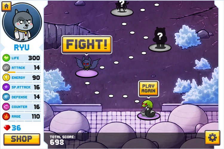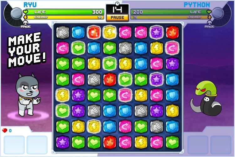 Mochi Media is proud to present this fast-paced action fighter with match-3 gameplay! Featuring awesome animations, sound effects, powerups and bosses, this is sure to be one of the most intense action puzzle experiences you'll play in a while! Choose from multiple characters to travel through space and beat up on some baddies. Make sure to keep an eye on your health and special meter to unleash the most powerful attack across the galaxy!