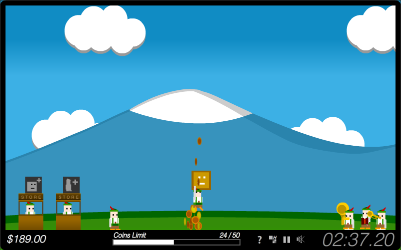This shop opens up to you after you buy your first worker for $20.00 at the character upgrade shop. Here, you can buy upgrades to increase the upper limit of how many coins can be on screen at any given point in time. You can also buy the Tactical Nuke here for $1,000,000 to finish the game.