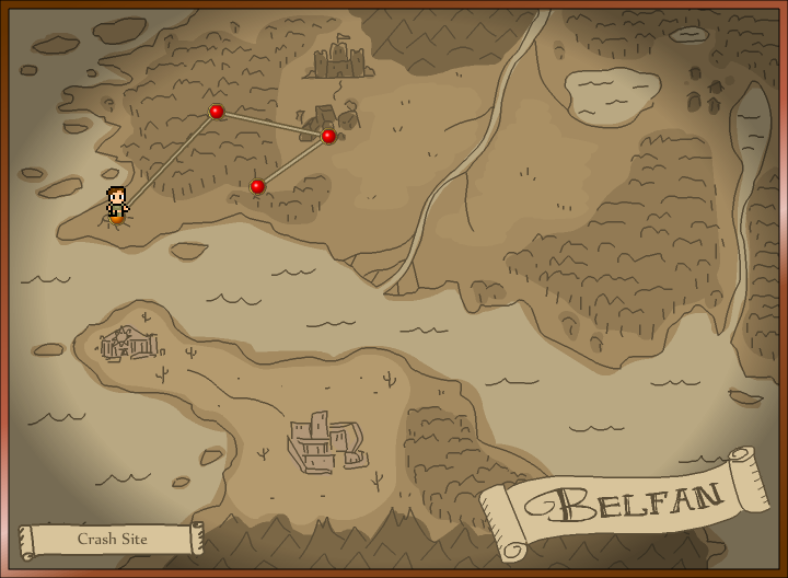 Gameplay of MARDEK RPG: Chapter 1 involves travelling around town or dungeon areas to advance in a quest you are given. While fulfilling such a quest, you are likely to engage in random enemy encounters and some plot-related boss encounters while not in a town. In such battles, turns go between each of your party members and each monster. On one of you party member's turns, you can fight with a weapon, use skills, use an item, skip your turn, or flee from the battle (random encounters only). Defeating monsters in battle can grant you experience points to level up, money, and items. In towns, you can enter shops to purchase or sell some items. When you exit an area or town, you are brought to a world map where you can travel to any other area that is available to you.