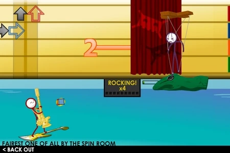 Arrow key commands require you to hit the correct key at the correct time, while number/letter commands require you to hold the key down for a certain period of time. Getting a combo of 10 correct commands in a row increases your multiplier, which increases the points you earn x2, x3, x4, and in Pro Mode, x5 and x10. Each time you make a command mistake, your multiplier is decreased. Your accuracy when hitting the notes determine your score, which determines if you get a Bronze, Silver, Gold or Perfect Star on the song. Your avatar is a stickman which changes animation if you do well on a song, doing crazier actions the better you play.