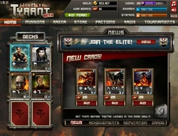 Tyrant is an online collectible card game with a large number of available cards. It is based on the War Metal game, is set in the same universe as War Metal, and takes place decades into the future. New players are presented with a tutorial, which helps the player through the first two missions. The game started as a Facebook app, but is now also available on Kongregate. The game uses a micro-transaction currency called War Bonds, which you can purchase for Kreds. War Bonds may also be obtained in the random Daily Gifts.